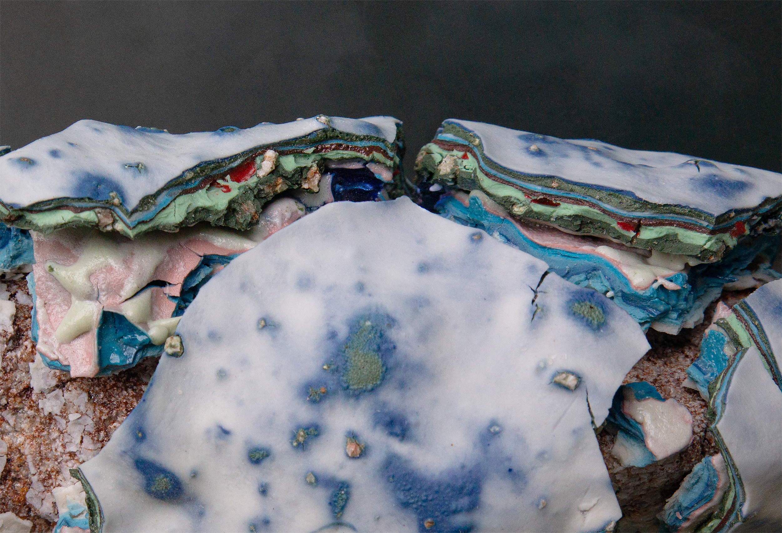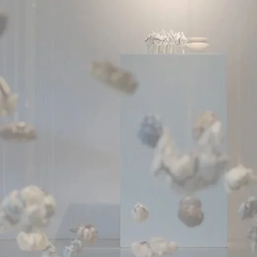 The flexible or fragile clay body and mixed minerals change its properties drastically into solid and permanent once it is fired. The long-making process gives her enough time to recollect the moment she is putting into the work. Ceramics is an accurate medium for her to create containers for ephemeral memories and future histories, coalescing her qualia into them to give the invisible a permanent form to preserve them.
